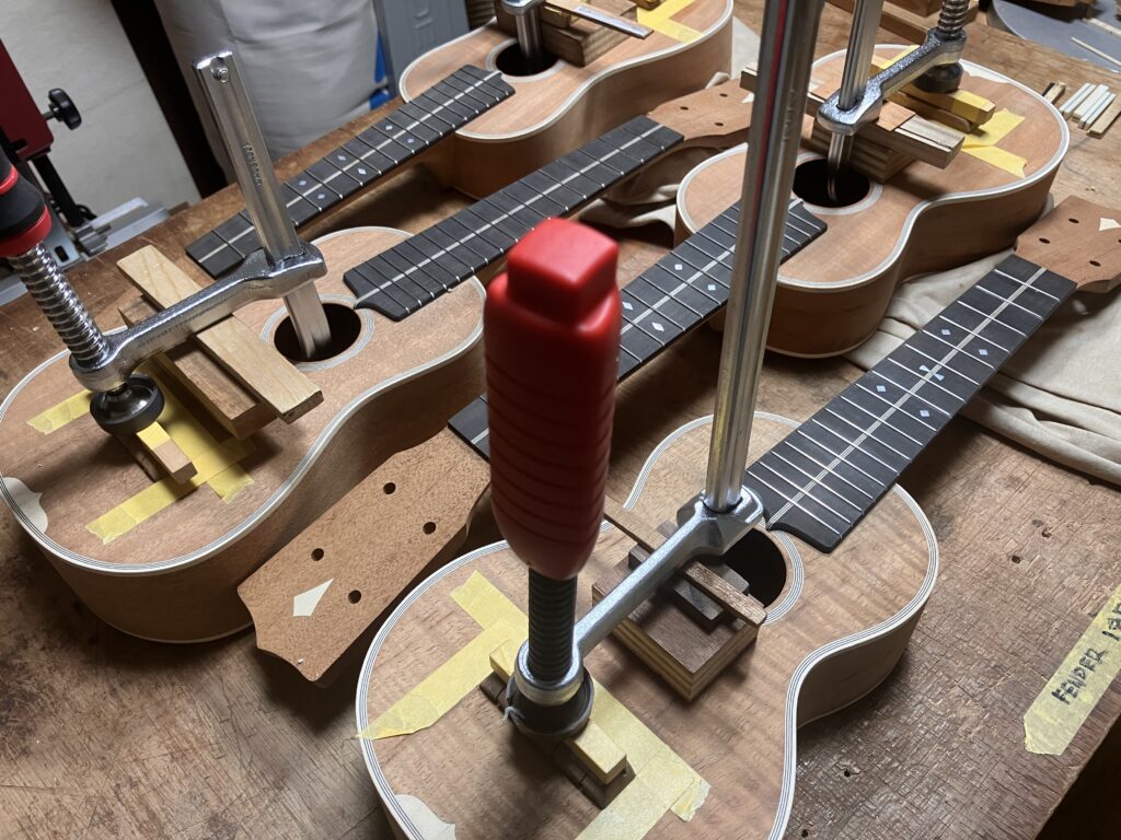 それぞれ、積層接着後、整形、弦溝、と進め接着しました。