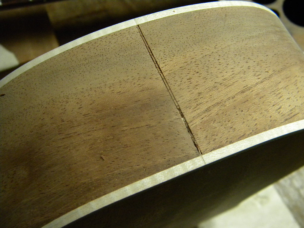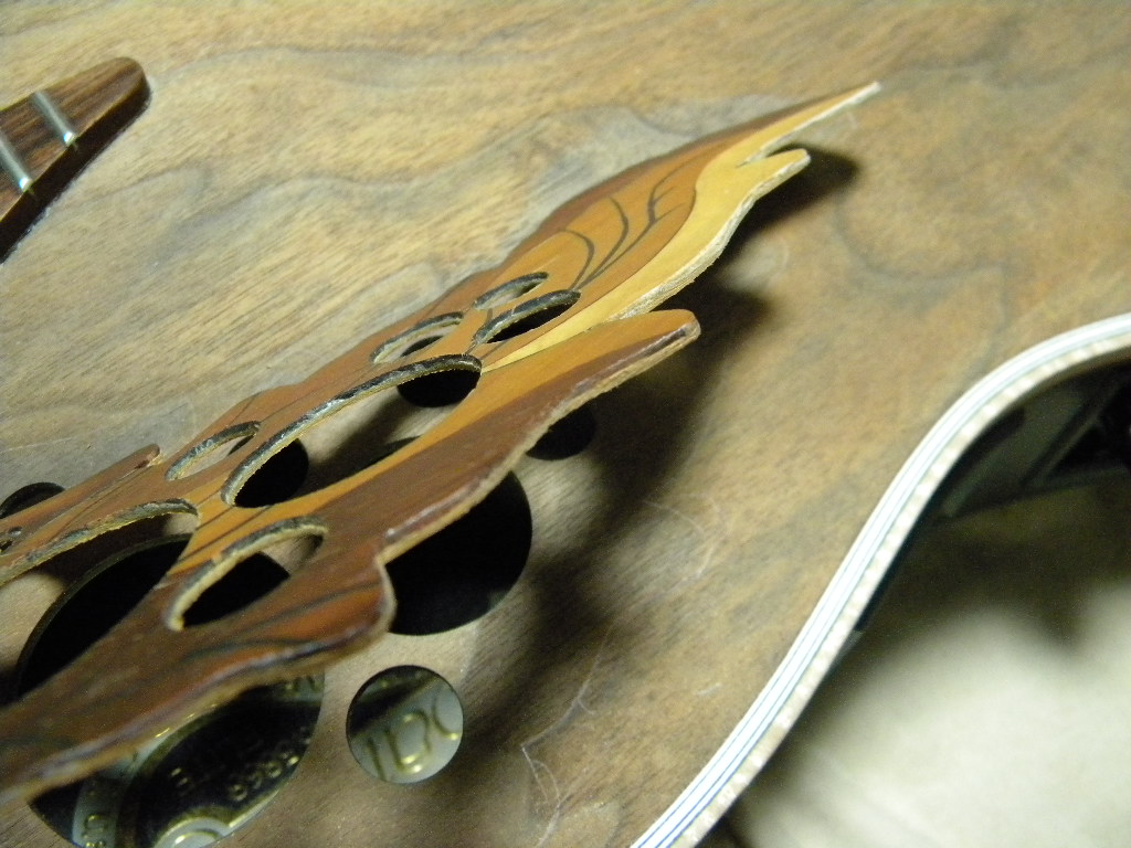 リペアはエポーレットの接着法を考えてましたが、裏打ちした材の分、表板を彫り込むことにしました。