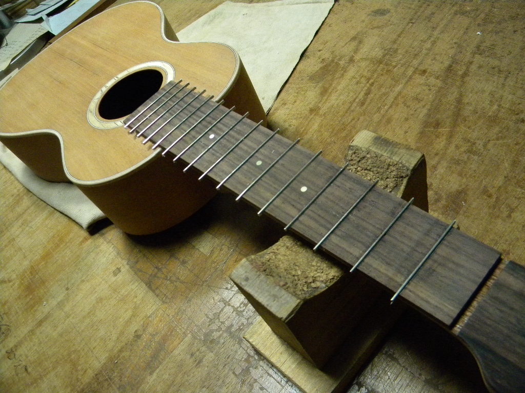 いつも通り、膠で緩み留めしたので、1日乾燥させてからフレットを仕上げていく予定です。