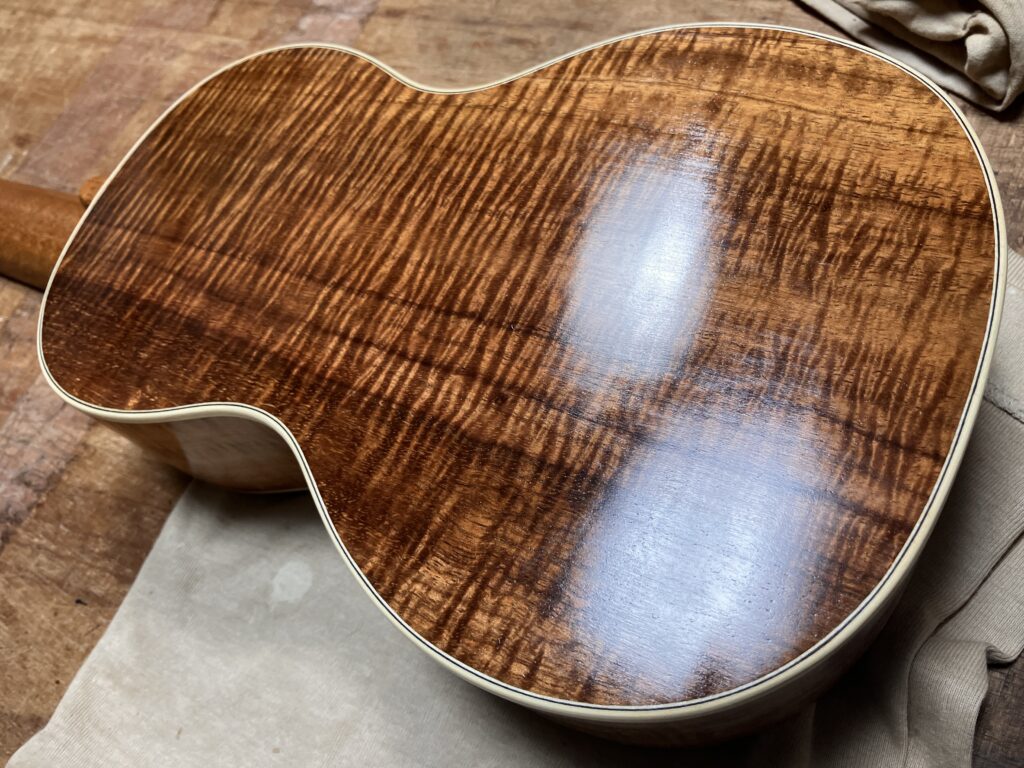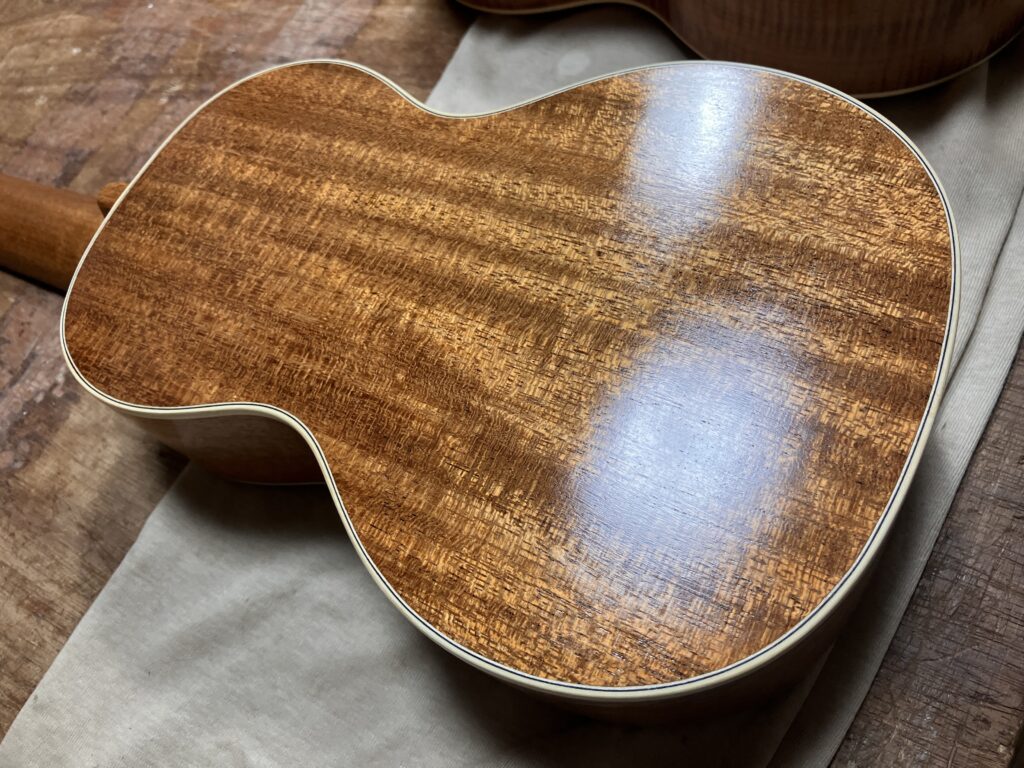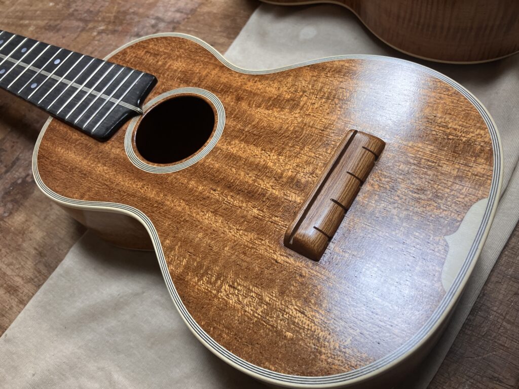 2025-12-24 ウクレレ、セラックフレンチポリッシュ 今日は曇ったり雨が降ったり。 ウクレレは目止めが終わって、塗工程。 セラックフレンチポリッシュ中です。 塗り途中のウクレレです。 もう少し塗ったら、仕上げて行きます。 Home › Blog › ウクレレ、セラックフレンチポリッシュ 関連記事 ウクレレ、ネック仕込み 3M、指板平面出しとブリッジ ウクレレ、ネックダブテイル加工 ヴォボアン(カスタムオーダー 4コース) ウクレレ目止めとオベーションリペア ウクレレ、目止め終了 ウクレレ、セラックフレンチポリッシュ、仕上げ工程